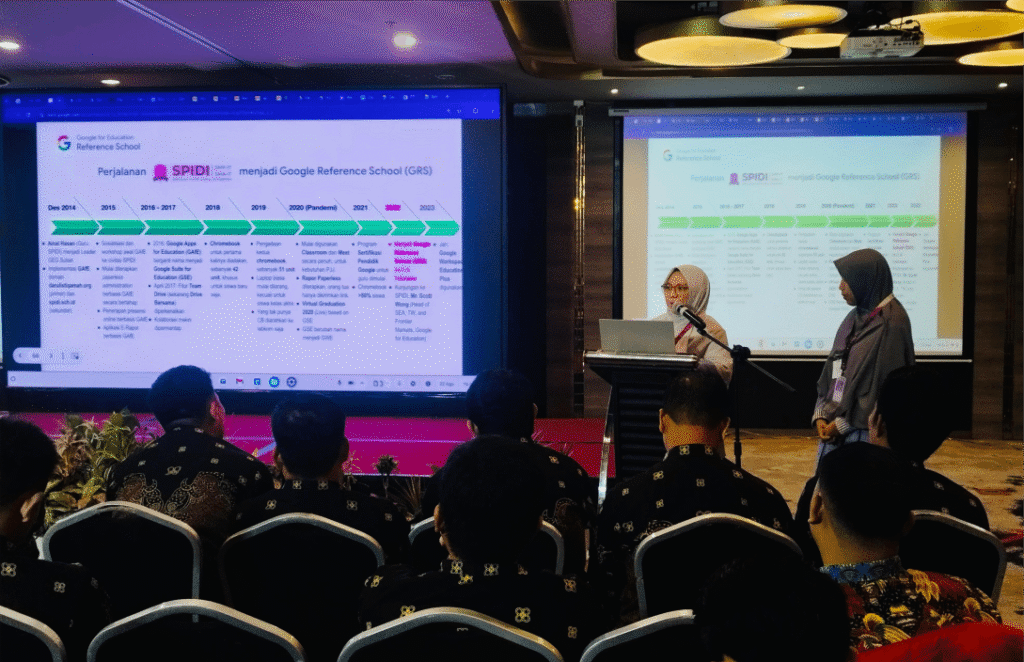 Refo Indonesia bekerja sama dengan IPEKA International Christian Schools mengadakan Road Show dan Sharing Session dengan tema “Mempersiapkan Sekolah di Era AI” di hotel Mercure, Makassar, Kamis 22/08. Dalam kegiatan tersebut, Sekolah Putri Darul Istiqamah (SPIDI) sebagai sekolah pertama Google Reference School (GRS) di Sulawesi Selatan dan yang ketiga di Indonesia dipercaya menjadi salah satu pemateri best practice dalam sharing session. Kepala SMA SPIDI, Irmayanti Arifuddin, M.Pd. dalam sesi berbagi tersebut menjelaskan praktik penerapan Google Workspace Education (GWE) , tools, kelebihan, dan tantangan penerapannya di SPIDI. “Penerapan GWE menjadi salah satu media pembelajaran yang efektif sekaligus menyenangkan bagi peserta didik. Dengan teknologi Google, akses informasi dan ilmu semakin dekat, kemudian disajikan dengan konten yang lebih menarik hingga membuat anak-anak tak bosan mengikuti pembelajaran,” ujar Irmayanti dalam sambutannya. Peserta berjumlah 70 orang yang berasal dari berbagai sekolah besar di Sulawesi Selatan begitu antusias mendengarkan. Beberapa sekolah dalam sesi tanya mengaku tertarik mengaplikasikan pembelajaran GWE. Dalam sambutannya, Principal Learning Consultant REFO Indonesia, Steven Sutantro mengatakan bahwa SPIDI adalah contoh sekolah yang menerapkan GWE. “Teman-teman tak perlu jauh-jauh jika ingin belajar tentang penerapan teknologi digital dalam pembelajaran. SPIDI sebagai sekolah pertama di Sulawesi Selatan menerapkan GWE bisa menjadi referensi kita semua,” ajak Steven.